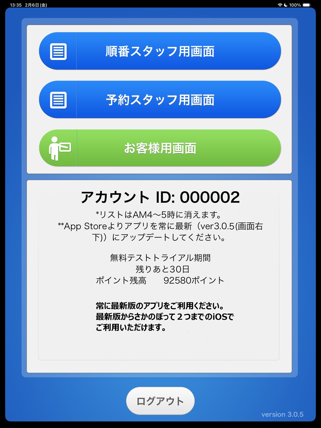 お客様セルフ受付用の 「お客様用画面」がが表示されました。こちらからお客様は順番待ちの受付を行えます。