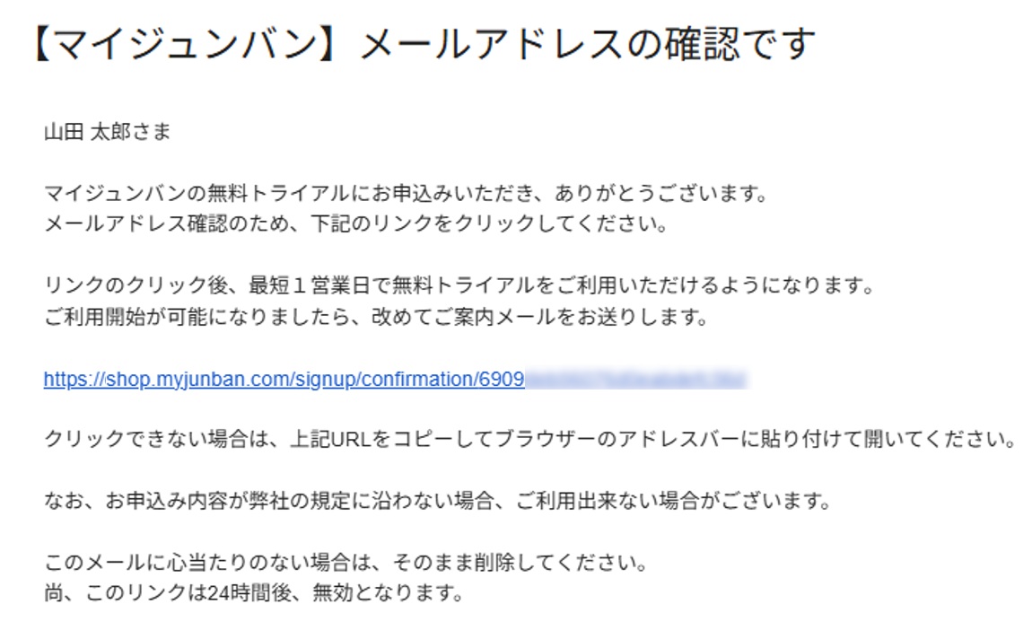 最短1営業日で登録内容の確認が行われ、「【マイジュンバン】 トライアルがご利用頂けます。」と題したメールが届いたらトライアルをご利用開始頂けます。